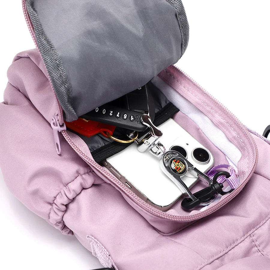 - Bolso frontal com zíper para guardar chaves, fones ou cartões.